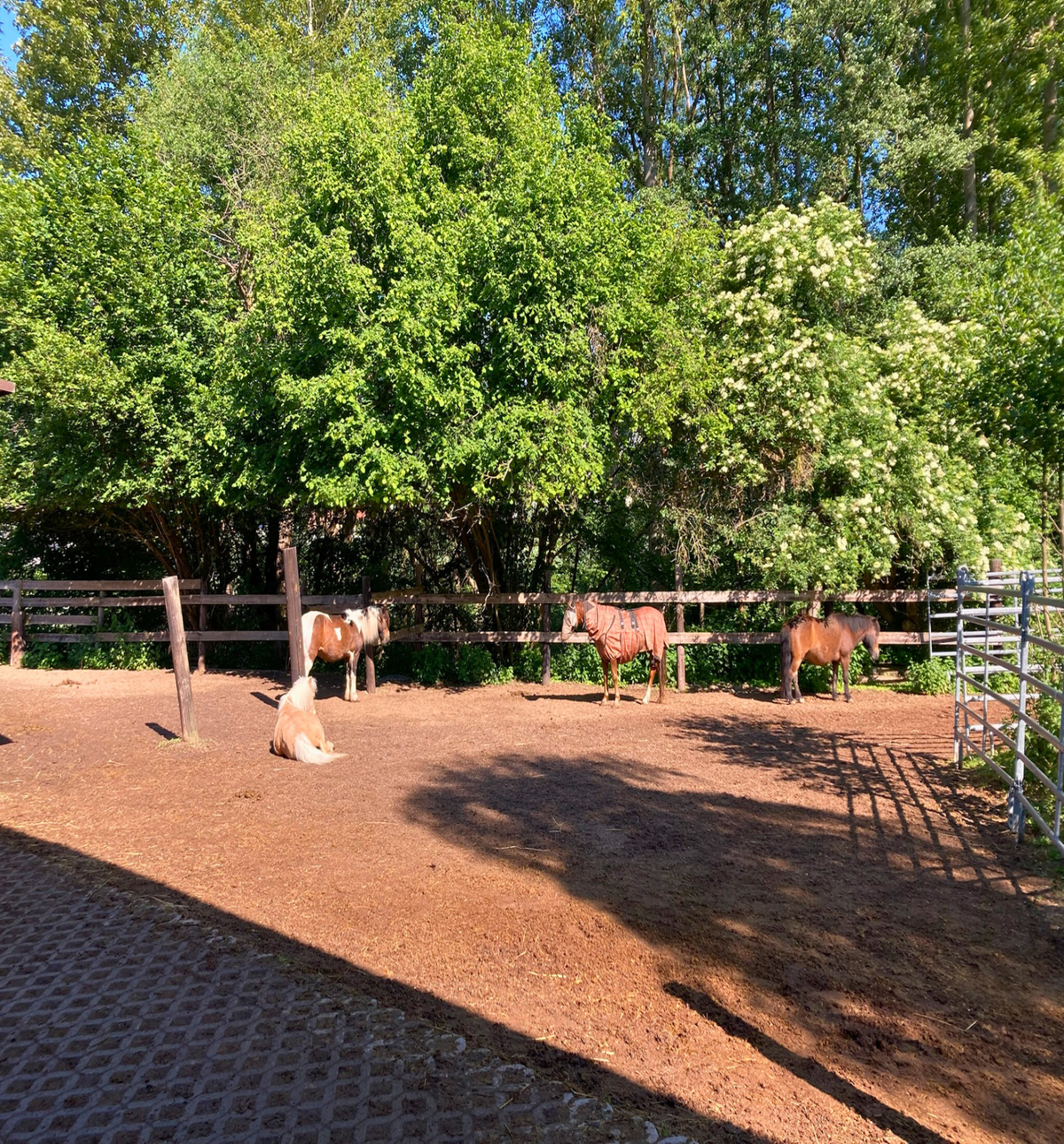 Für die Pferde stehen rund 3.000 m² befestigte Auslaufflächen zur Verfügung. Ergänzt wird die Anlage durch beheizte Tränken sowie eine 10.000-Liter-Regenwasserzisterne, die unter anderem für die Beregnung der Reithalle genutzt wird.
