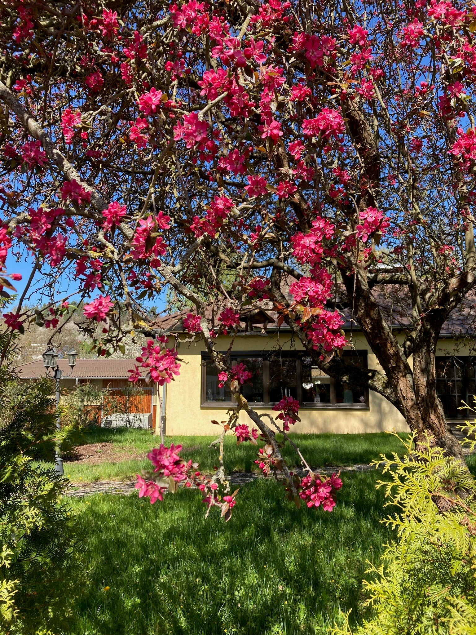 Der obere Grundstücksbereich ist parkähnlich angelegt und geprägt von altem Baumbestand sowie großzügigen Grünflächen. Die überdachte Pergola befindet sich im Hofbereich zwischen Wohnhaus und Stallanlage und bietet einen geschützten Sitzbereich mit direktem Blick auf den Hof und die Pferde – ein besonders atmosphärischer Ort zum Verweilen.