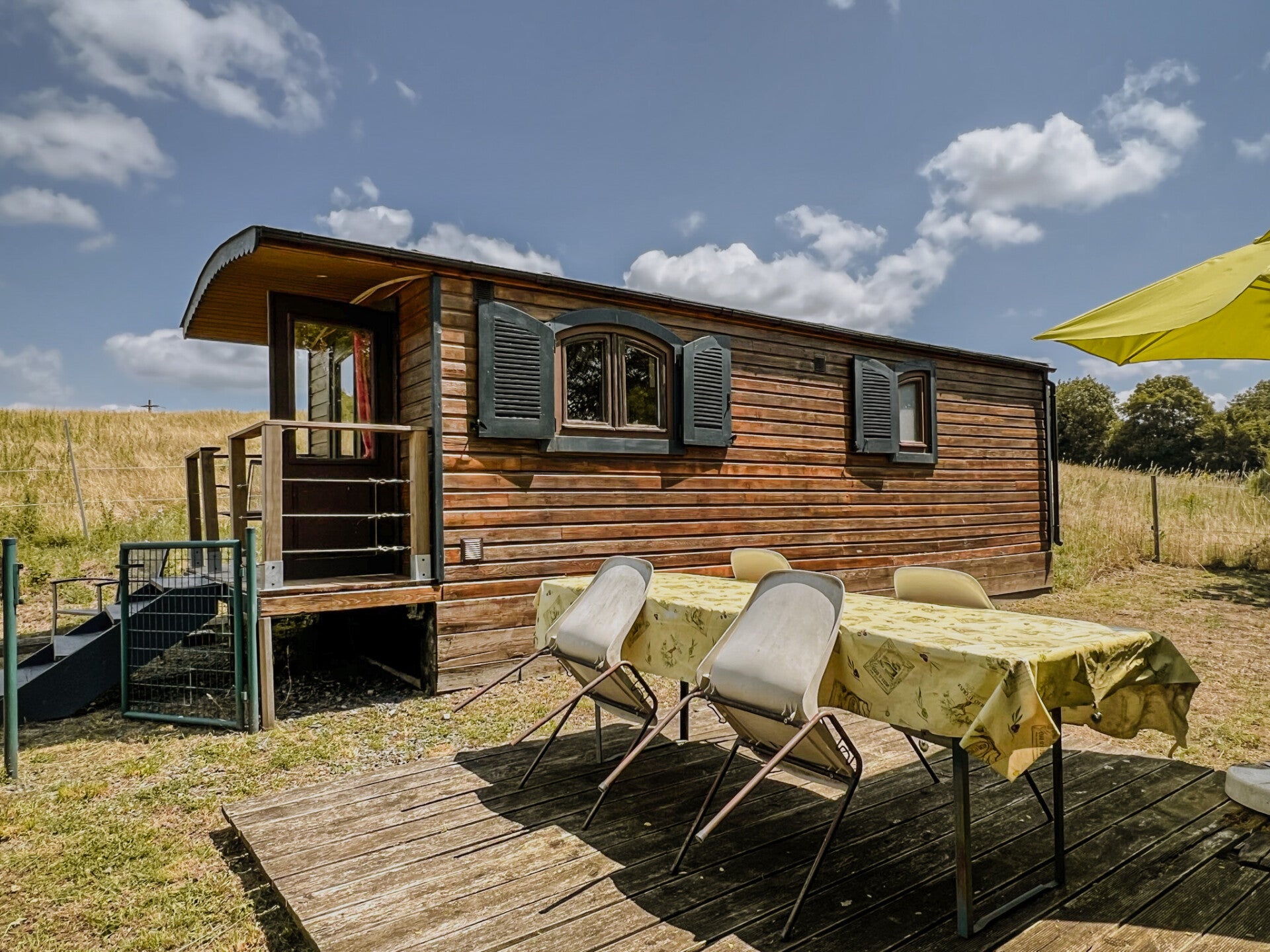 Holzwohnwagen mit Schlafraum, kleiner Küchenzeile, Dusche/WC und Terrasse. Eigene Abwasseranlage vorhanden; Zustand leicht renovationsbedürftig.